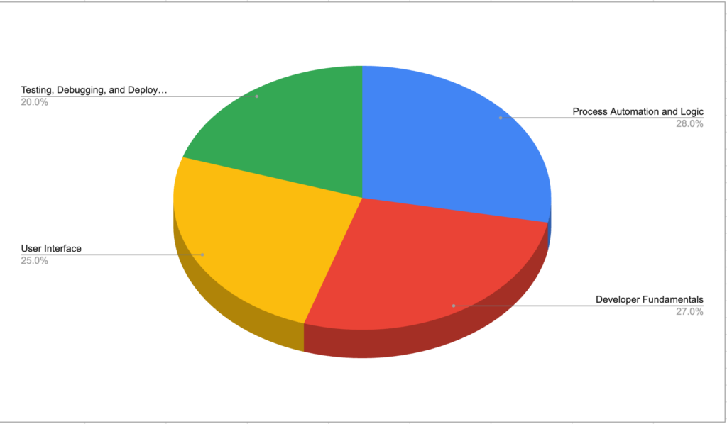 In Platform Developer, there are 4 topics covered. The topic with the highest weighting is Process Automation and Logic. As it is weighted at almost half of the entire exam, this is an area that you must focus on to do well in the exam.