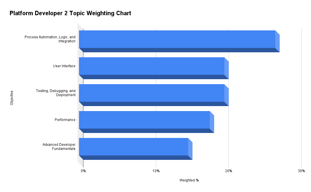In Platform Developer 2, there are 5 topics covered. The topic with the highest weighting is Process Automation, Logic, and Integration. As it is weighted at 24%, this is an area that you must focus on to do well in the exam.