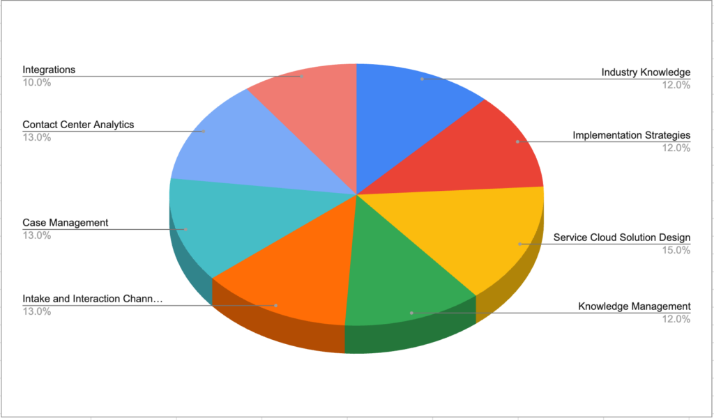 In the Service Cloud Consultant exam, there are 8 core topics covered. The key areas of service cloud have the highest weightings such as case management, service console, and designing an overall service cloud solution, so these areas must be focused on to do well on the exam.
