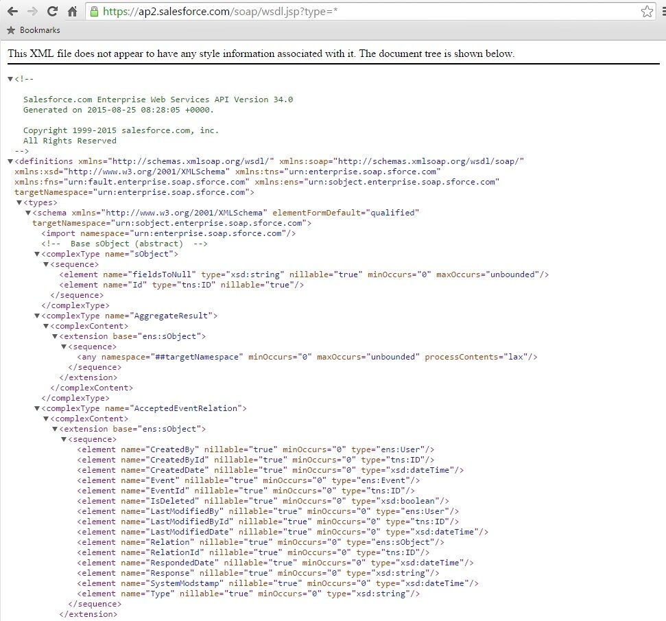 Notice the link to generate Enterprise WSDL. Clicking on this link, would generate the enterprise WSDL for you, and it should look something like this: