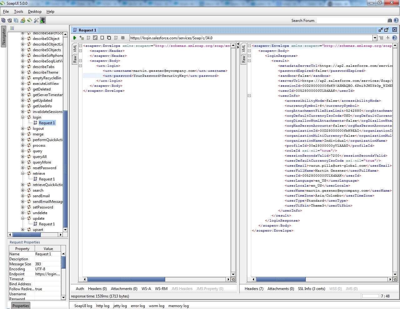 This is a request-response dialogue. In the left hand side you would find the request submitted, which was a simple request for logging in; and on the right hand side you would see the response received. This is what Salesforce return as an answer to your request. Since our request was a login request, the response contains a Session ID, which shows that login was successful.