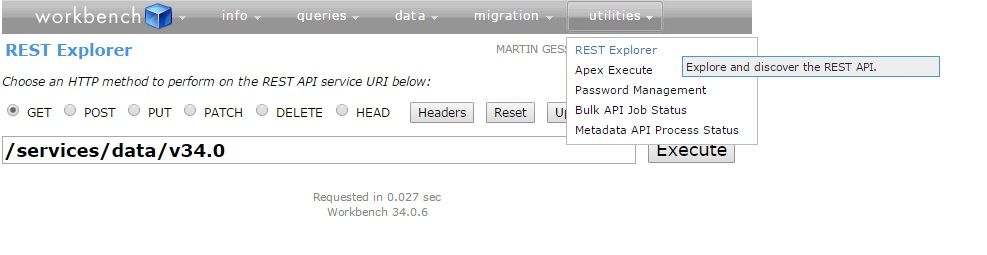 Let’s try it out. While you could use SOAP UI or chrome POSTMAN plugin to REST services, here I am going to use Workbench. Open Workbench and log in to your Salesforce instance. In the Utilities section, choose REST Explorer to bring up a screen as shown below.