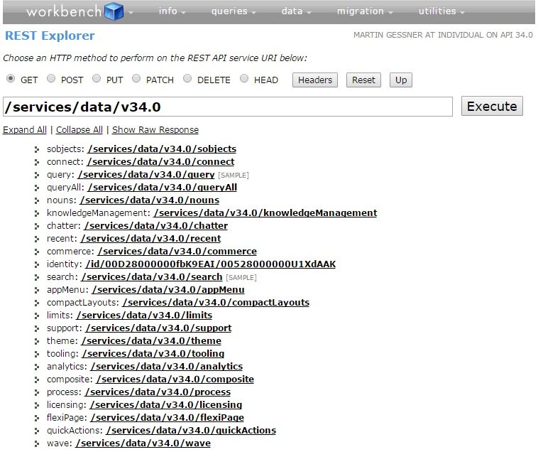 Clicking the Execute button would bring up all the available resources that Salesforce offers.