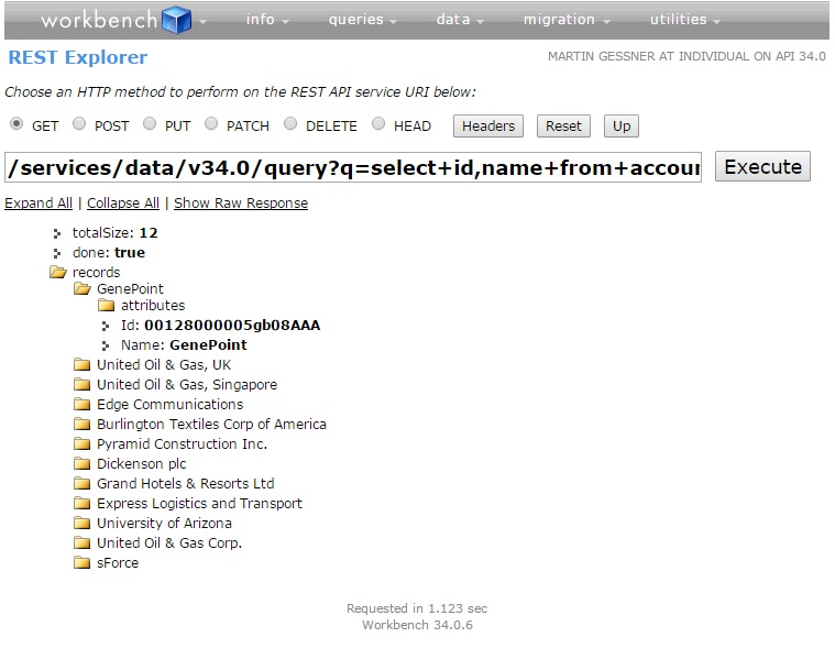 Let us do a query on Account for name and ID. All you need to do is pass the right SOQL statement as a query parameter for GET method. All the spaces in the SOQL statement would need to be replaced by a + sign. Once you have the query constructed, click execute to get the results as shown: