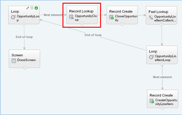 - As you can see, arrows are pointing to each other, meaning, as long as the loop still have line items records to iterate, it will continue to create, otherwise, it will go back to the first opportunity loop for the next opportunity record, if there are any.