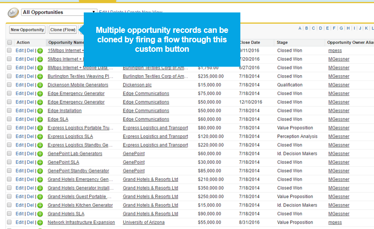 This example will show how to clone multiple opportunity records, including the opportunity products, on a list view by calling a Visual flow from a custom button.