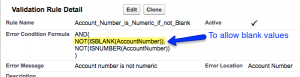 - If a user tries to save a record but leaving the Account Number field blank. Blank is a value. The validation rule created for the Account Number field will run as follows: