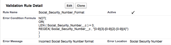 Note that OR is used here to prevent a record from being saved if EITHER of the conditions return TRUE. If SSN length (LEN) is not 0 (a blank value wouldn’t cause an error message but any other random value would);