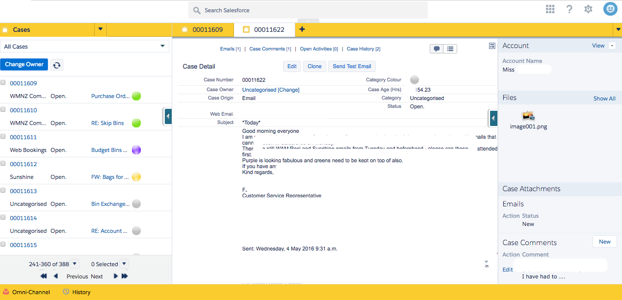 After a event free go live, omni-channel routing and email to case are successfully tracking all client customer enquiries, user responses are being owned and shared, double handling and lost data have been minimised and the team has a clearer understanding of their case loads, while management are able to review their service approach and adjust with the use of salesforce standard reporting.