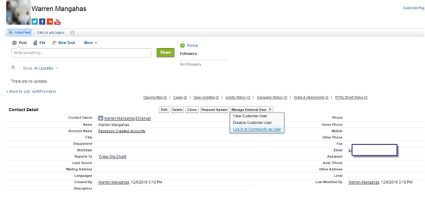 - I created an Account called “Facebook Created Accounts” to be used as the Account on all the new Contacts created through the community.