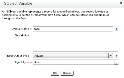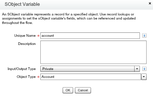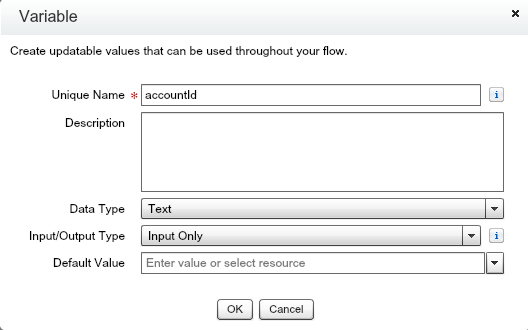 accountId – This is a Text variable which contains the Account Id of the record being processed. It will be initialized from outside the flow, so it has ‘Input only’ as the value for the visibility parameter: