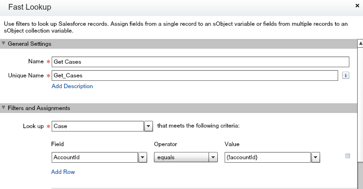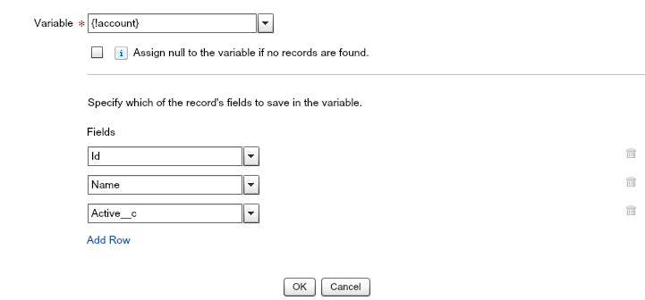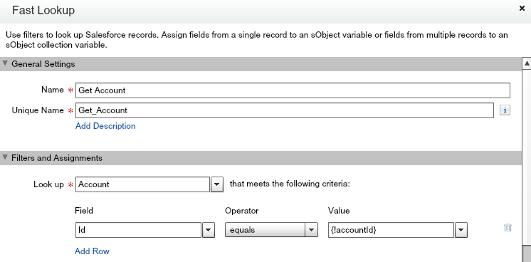 To begin, the Fast Lookup action will be used to retrieve the Account record related to the accountId variable. Fast Lookup allows an entire object to be stored in an sObject variable.