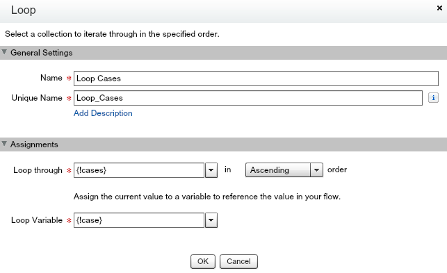 Now we have all of the related cases, we need to loop through them. A Loop action is used which will iterate through them and store the current case object in a variable.