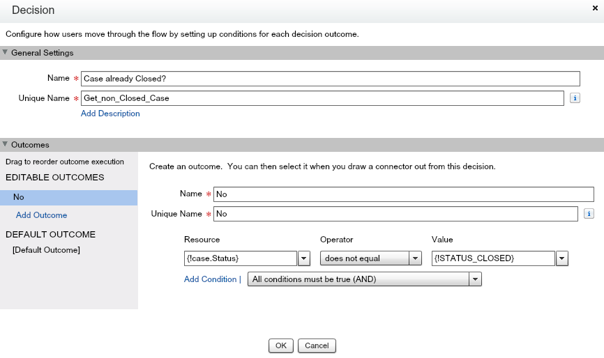 As you can see, in this action we iterate over the entire collection and use the Case variable as the loop variable. It’s time for adding additional actions to close and update cases! Now to check if the case is already closed, a Decision action is added: