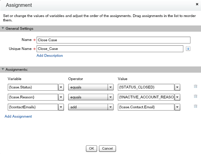 In the next step we use an Assignment action, to update the Case Status and Case Reason fields to the constant values we defined. We also save the case contact e-mails to ContactEmail collection.