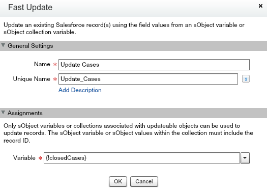 So now, we need to commit changes to all open cases have been updated. The next action will be Fast Update. *Note: We cannot use a Record Update action as it doesn’t support a bulk update.