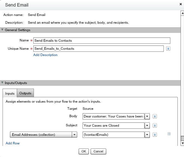 A final step remains – Notify the contacts of cases that been closed. This is done with a Send Email static action: