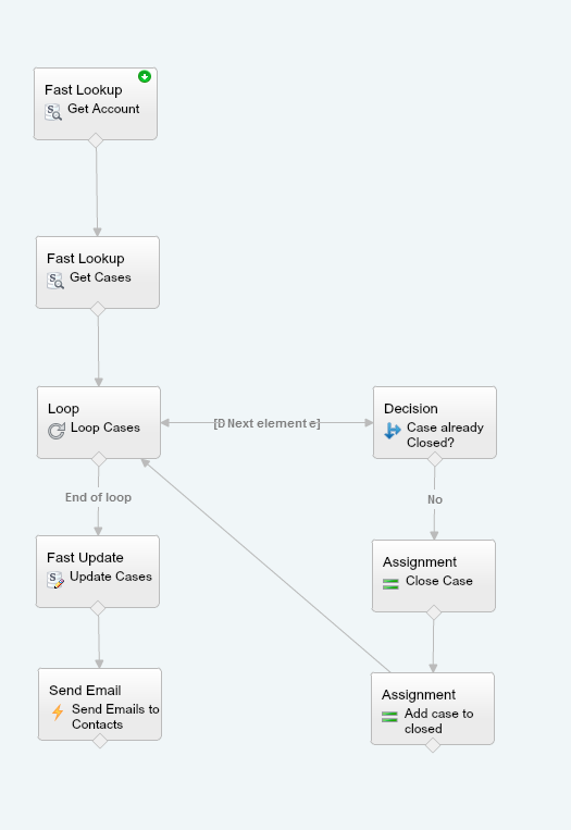 - Reference the related actions. End of loop references the Update Cases action and return into the loop is connected to the Case already Closed decision.