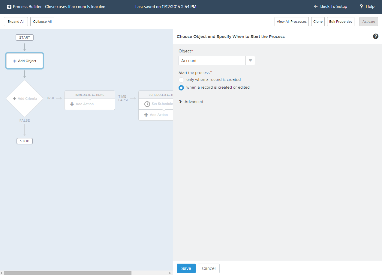 The Account object is added and the ‘When a record is created or edited’ condition: