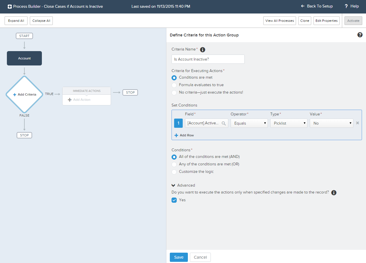 In the Criteria area we need to check if the account has been updated to Inactive.