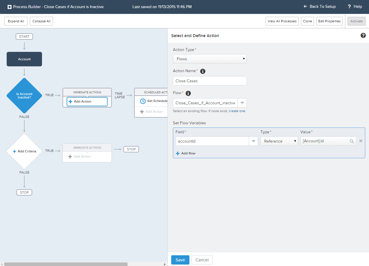 Now the flow is added as an action to the process. The ‘Flow’ action type is selected, and the accountId is passed as a flow variable.