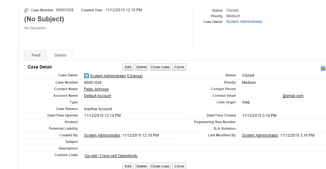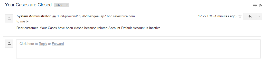 As a result you can see that our test case is closed with ‘Inactive Account’ reason and an e-mail notification has been sent: