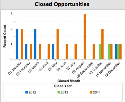 Lets say that you would like to report on the number of closed opportunities over the last 3 years. You would like to have months reported along the top in columns and the years down the side in the rows. The report will just include the number of opportunities closed in each of the months.