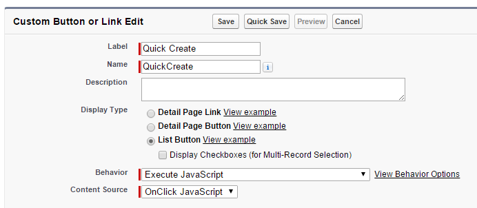 Select “List Button” display type, “Execute JavaScript” behavior and “OnClick JavaScript” content source. It will execute our JS code on click.