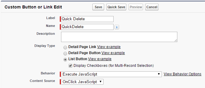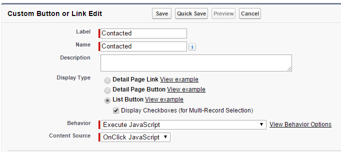Finally, lets add a button to delete selected records. Go to Setup – Customize – Contacts – Buttons, Links, and Actions and click the “New Button or Link” button: