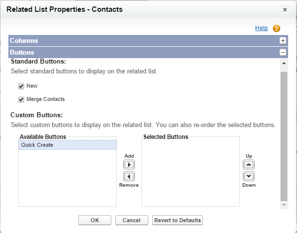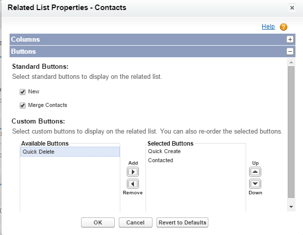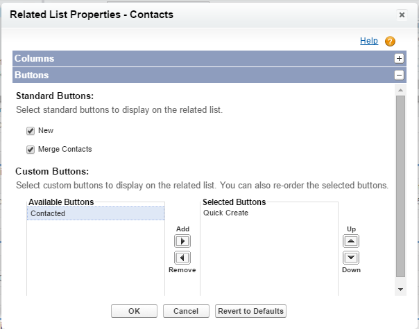 Let’s check our button! Go to Setup – Customize – Accounts – Page Layouts and select the layout you need to customize. In Page Layout Editor hit on the Contacts Related List Properties sign and go to the Buttons section: