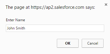 var name = “”;while (name === “”) {name = prompt(“Enter Name”);}contact.LastName = name;contact.AccountId = “{!Account.Id}”;contact.Phone = “{!Account.Phone}”;contact.Status__c = “Inactive”;