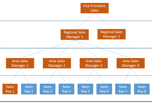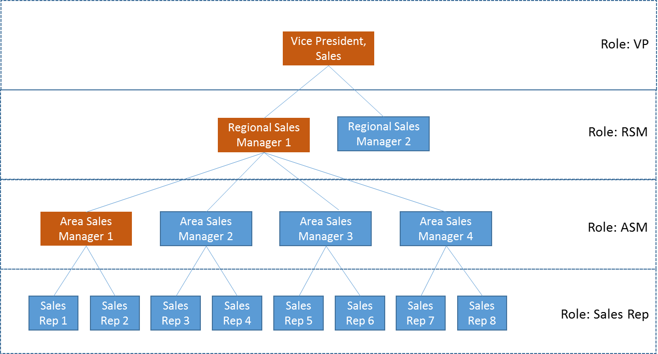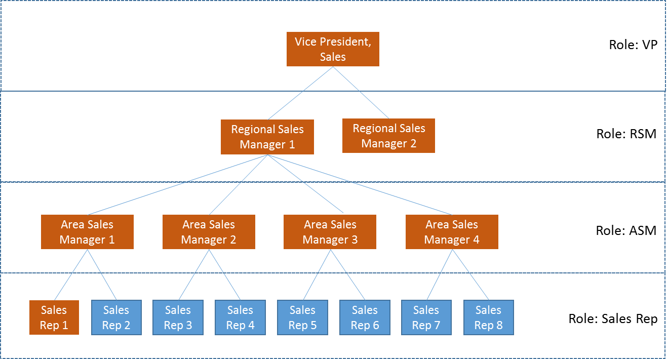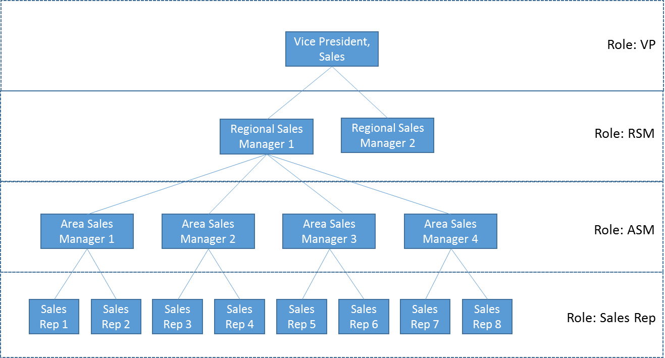 This represents an org, which uses four distinct Roles – VP, RSM, ASM, and Sales Reps, to define the various users in the respective roles.