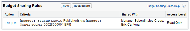 The following image below shows a sharing rule definition on Budget, which ensure all budget records in status = “Published” and owned by Eric Cantona, would become visible to his direct and indirect subordinates.