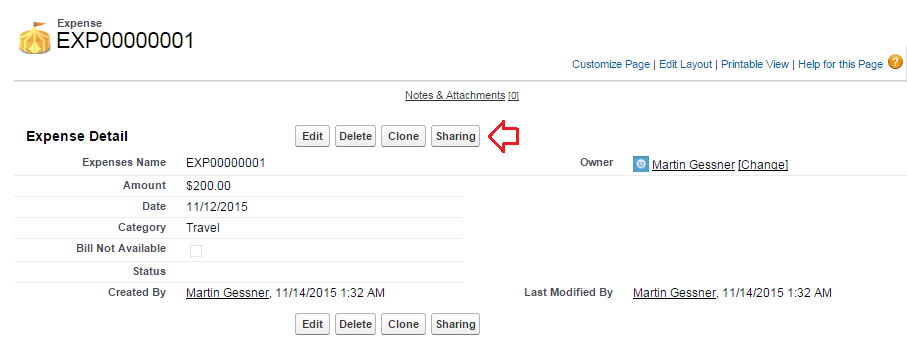 Manual sharing is invoked by clicking the “Sharing” button available on a record detail page.