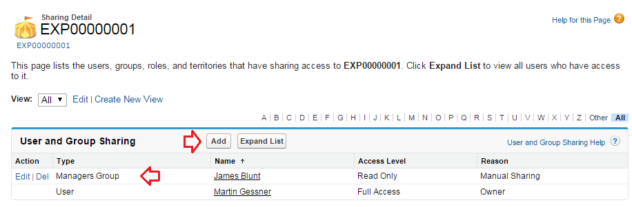 As for expense records, let us consider using manual sharing rules – which would allow a sales rep user to push an expense record to a manager group.