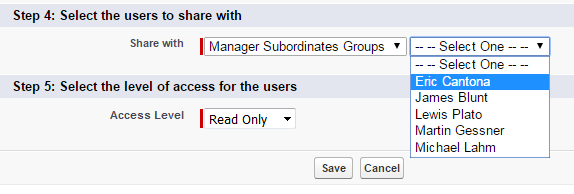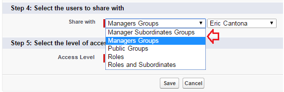 While using Manager Groups, a user is provided with two choices of sharing, as shown in the diagram below: