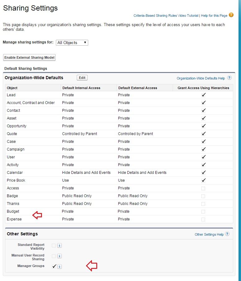 Once the user hierarchy is fully set, you can visit the Sharing Settings page to define the Manager Group sharing behavior. In order to see full effect, be sure to turn off the “Grant Access Using Hierarchies” setting for the object in focus.