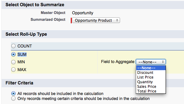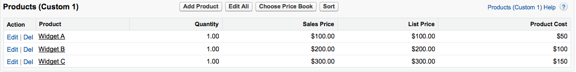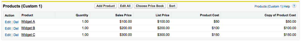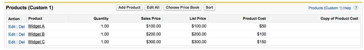 Roll-up summary fields are a very useful Salesforce feature, but you may come across a situation where you need to rollup the value of a formula field. Here is an example: You have added a custom field to the Product object to record the cost of a product. You want the total cost of all products added displayed on an opportunity. In the screenshot below you can see Widget A has a cost of $50.