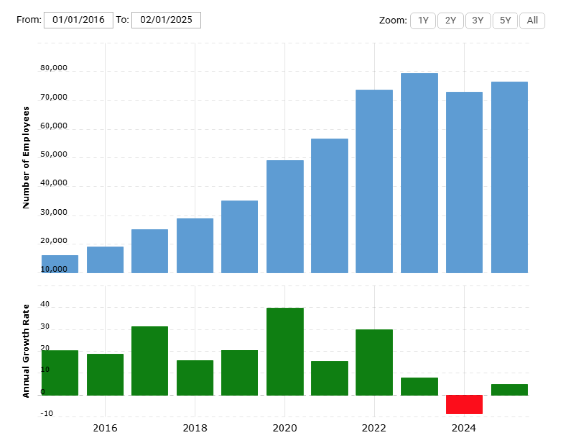 Number of Salesforce employees from 2016 to 2025. Image source: Macrotrends