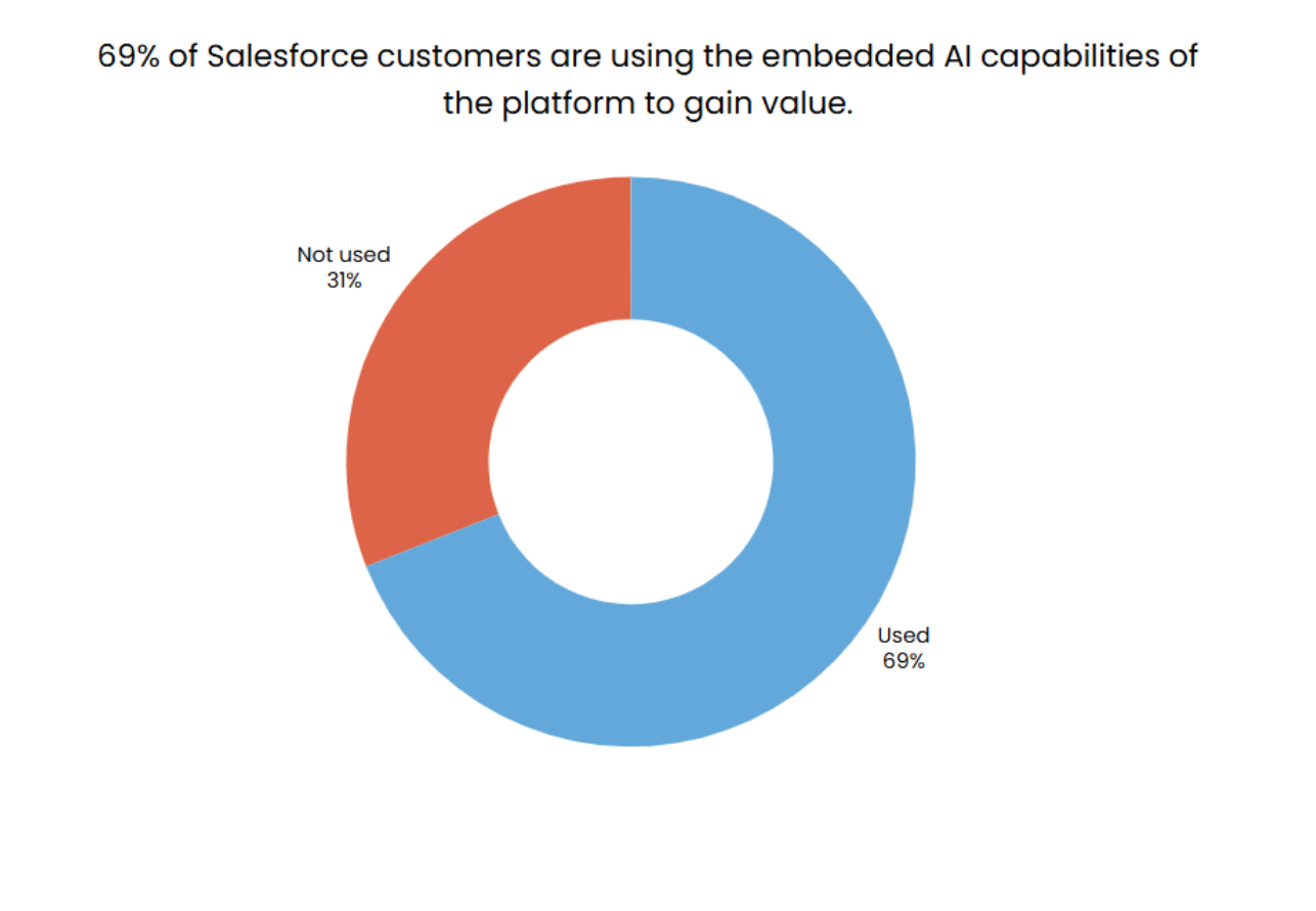 The “State of Salesforce 2024-2025” from IBM indicates an undeniable trend towards the adoption of AI solutions by Salesforce users: a significant majority of Salesforce customers (69%) are leveraging the platform’s built-in AI for value. AI adoption rate on the Salesforce platform.