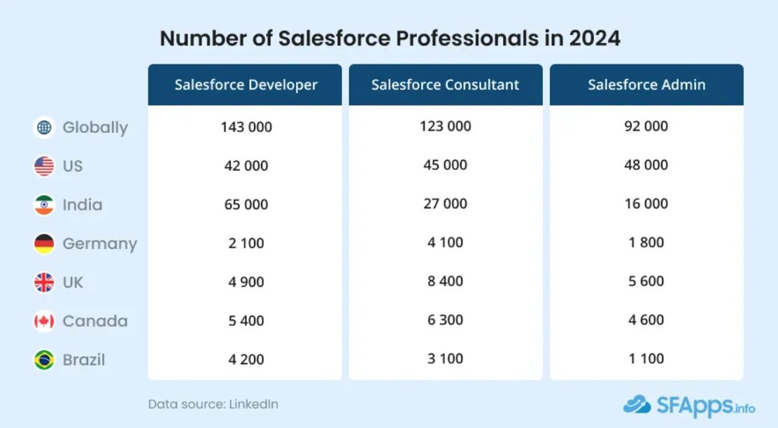 For context, the image shows a 2024 LinkedIn snapshot: over 135,000 professionals in Salesforce Developer, Consultant, and Admins roles – in the U.S. alone.