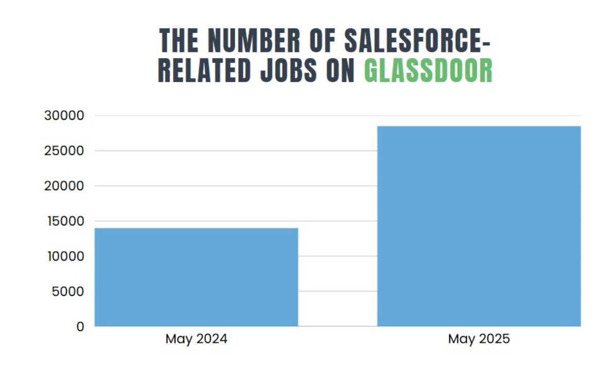 We can compare numbers from job boards. The chart below shows the number of Salesforce-related job listings on Glassdoor at the beginning of May 2024 (about 14,000) and in May 2025 (about 28,500) for the U.S. job market.