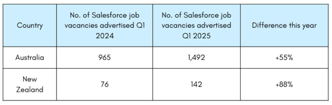 Another example is Australia and New Zealand, where we can see a significant increase in Salesforce job vacancies in Q1 2025 compared to Q1 2024. Australia experienced a 55% rise in vacancies, and New Zealand saw an even more substantial 88% increase.